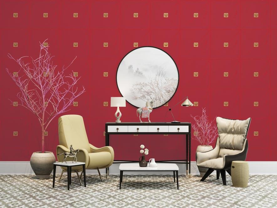 說到強(qiáng)烈又不常見的配色,當(dāng)然要數(shù)紅色。熱烈璀璨的紅色調(diào)宜可作為空間的主題色,也可作為搭配色。在壁紙中,熱情的中國紅帶著強(qiáng)烈的連續(xù)感和現(xiàn)代感,絢爛摩登的色調(diào)在精致的手工燙金車線下閃爍著光芒,一派奢華視覺效果。
