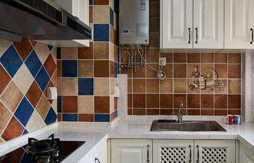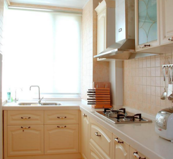 這款廚房面積相對狹小,過道只能容納一個人通行。白色鑲嵌式的整體櫥柜設(shè)計,有效的節(jié)省了空間,并且收納功能也很強(qiáng)大。墻磚采用斜紋的鋪貼與地面瓷磚互相呼應(yīng),濃濃的田園風(fēng)情盡在其中。