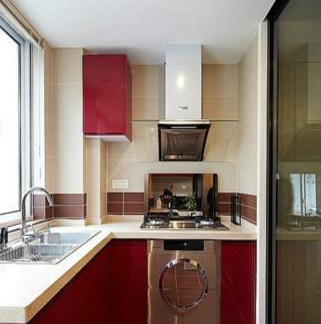 這款小陽臺廚房裝修采用了紅色櫥柜設(shè)計,柜面采用淺色大理石臺面。紅色讓整個廚房充滿著時尚與活力。暗紅色的地磚與白色瓷磚墻面相,讓整體廚房產(chǎn)生一種清新與熱情的碰撞。