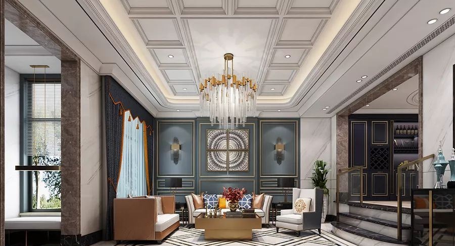 客廳浪漫又不失溫馨的造型,高品質(zhì)的家具結(jié)合墻面大理石的紋理,再加上金屬線條的點(diǎn)綴,體現(xiàn)出現(xiàn)代風(fēng)格的可塑性,同時(shí)又不失品質(zhì)感的設(shè)計(jì)語(yǔ)言。整體空間使用米色和藍(lán)灰色為主色調(diào),流蘇狀的吊燈唯美又有格調(diào),加上暖暖的燈光,使整個(gè)空間有種輕奢高貴的感覺。