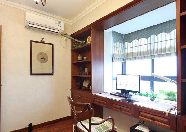 古香古色的書柜與飄窗完美結(jié)合,形成余地甚多的書桌,書桌下面還有空間,不會(huì)拘著雙腿的活動(dòng),而且外面的窗臺(tái)上還可以種點(diǎn)小花。