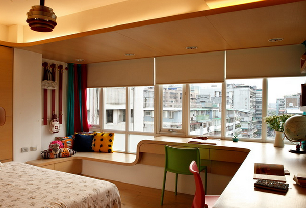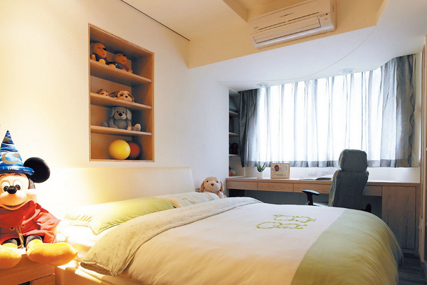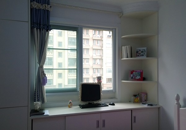 帶著轉(zhuǎn)角的書桌將范圍一下子擴(kuò)大了不少,同時(shí)高度之間的落差又考慮到了不同高度飄窗的作用,高一點(diǎn)的可以在上面做作業(yè)等等,低一點(diǎn)的可以直接坐在上面,抱著抱枕說說話是最好不過的了。